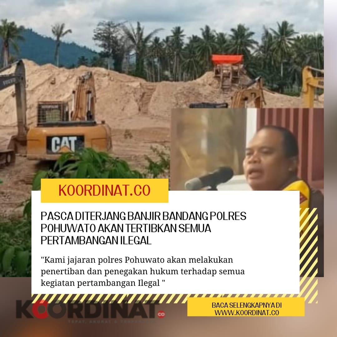 Koordinat.co,Kab.Pohuwato – Pihak Polres Pohuwato akan tertibkan semua kegiatan pertambangan tak berijin pasca beberapa wilayah pemukiman di kab.Pohuwato terendam banjir.