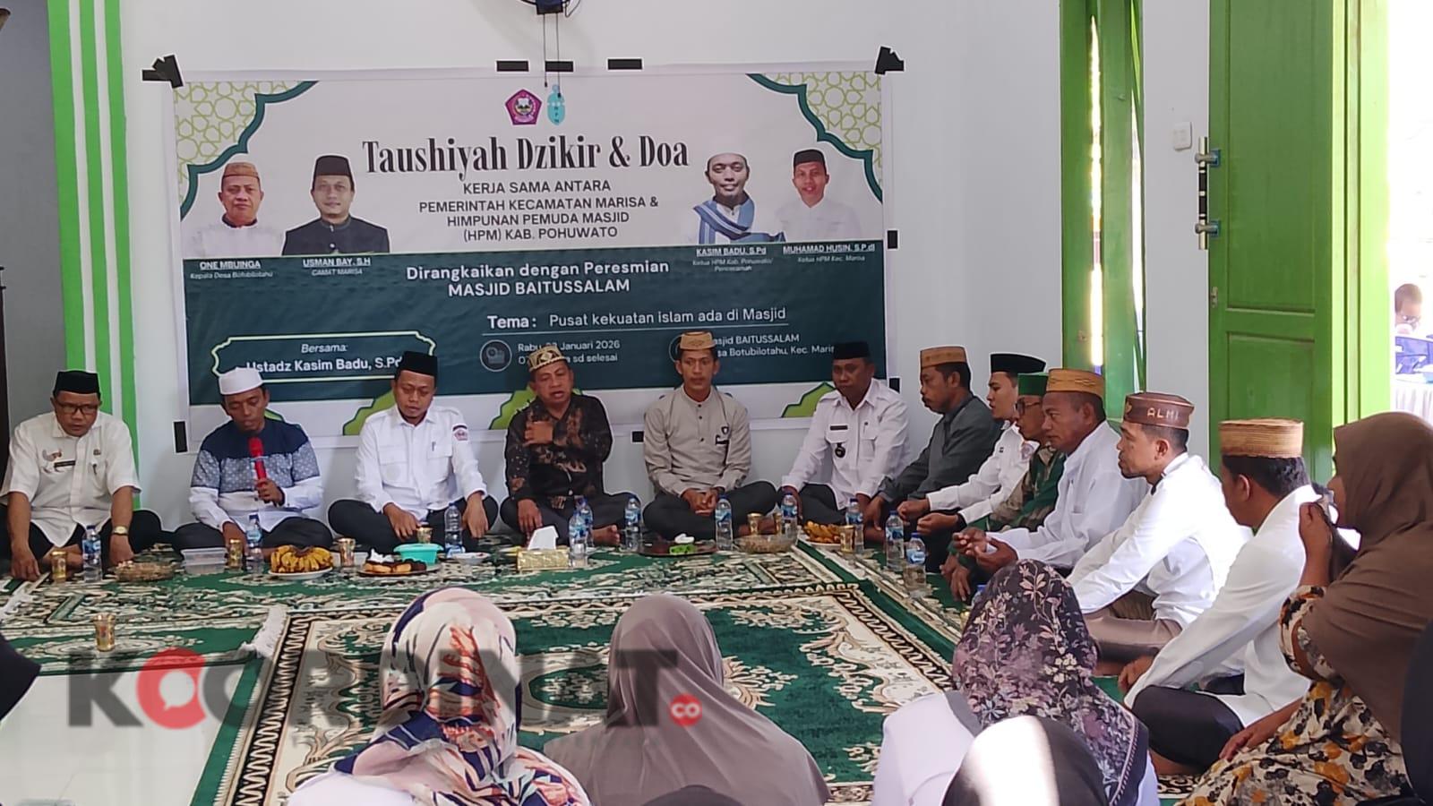 Koordinat.co, POHUWATO – Pemerintah Kecamatan Marisa bekerja sama dengan Himpunan Pemuda Masjid (HPM) Kabupaten Pohuwato menggelar kegiatan Taushiyah, Dzikir, dan Doa yang dirangkaikan dengan Peresmian Masjid Baitussalam, Rabu (28/01/2026). Kegiatan tersebut berlangsung di Masjid Baitussalam, Desa Botubilotahu, Kecamatan Marisa, sejak pukul 07.00 WITA hingga selesai.