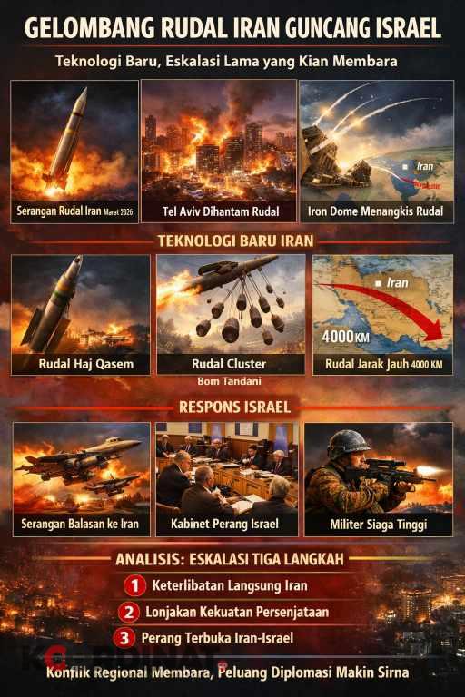 Jakarta, 24 Maret 2026 — Langit Israel kembali menyala. Sirene meraung di Tel Aviv dan sejumlah kota lain saat gelombang rudal balistik Iran menghantam wilayah tersebut, menandai babak baru eskalasi konflik paling berbahaya di Timur Tengah dalam satu dekade terakhir.