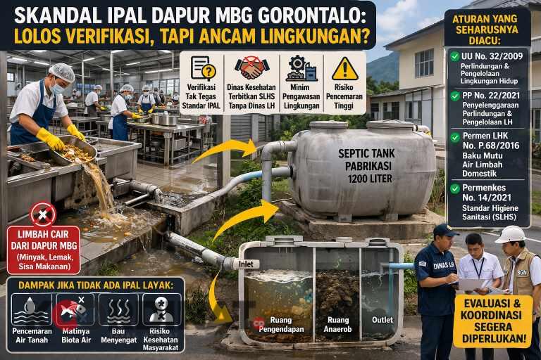Gorontalo, April 2026 — Polemik standar Instalasi Pengolahan Air Limbah (IPAL) pada dapur program Makan Bergizi Gratis (MBG) di Provinsi Gorontalo kini memasuki babak serius. Sejumlah Satuan Pelayanan Pemenuhan Gizi (SPPG) diketahui ditutup pemerintah karena tidak memiliki IPAL atau tidak memenuhi standar lingkungan.