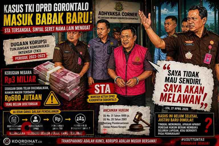 Gorontalo, 27 April 2026 — Penetapan mantan Ketua DPRD Kabupaten Gorontalo berinisial STA sebagai tersangka dalam dugaan korupsi Tunjangan Komunikasi Intensif (TKI) tidak sekadar menutup satu bab, melainkan justru membuka potensi babak yang jauh lebih besar.